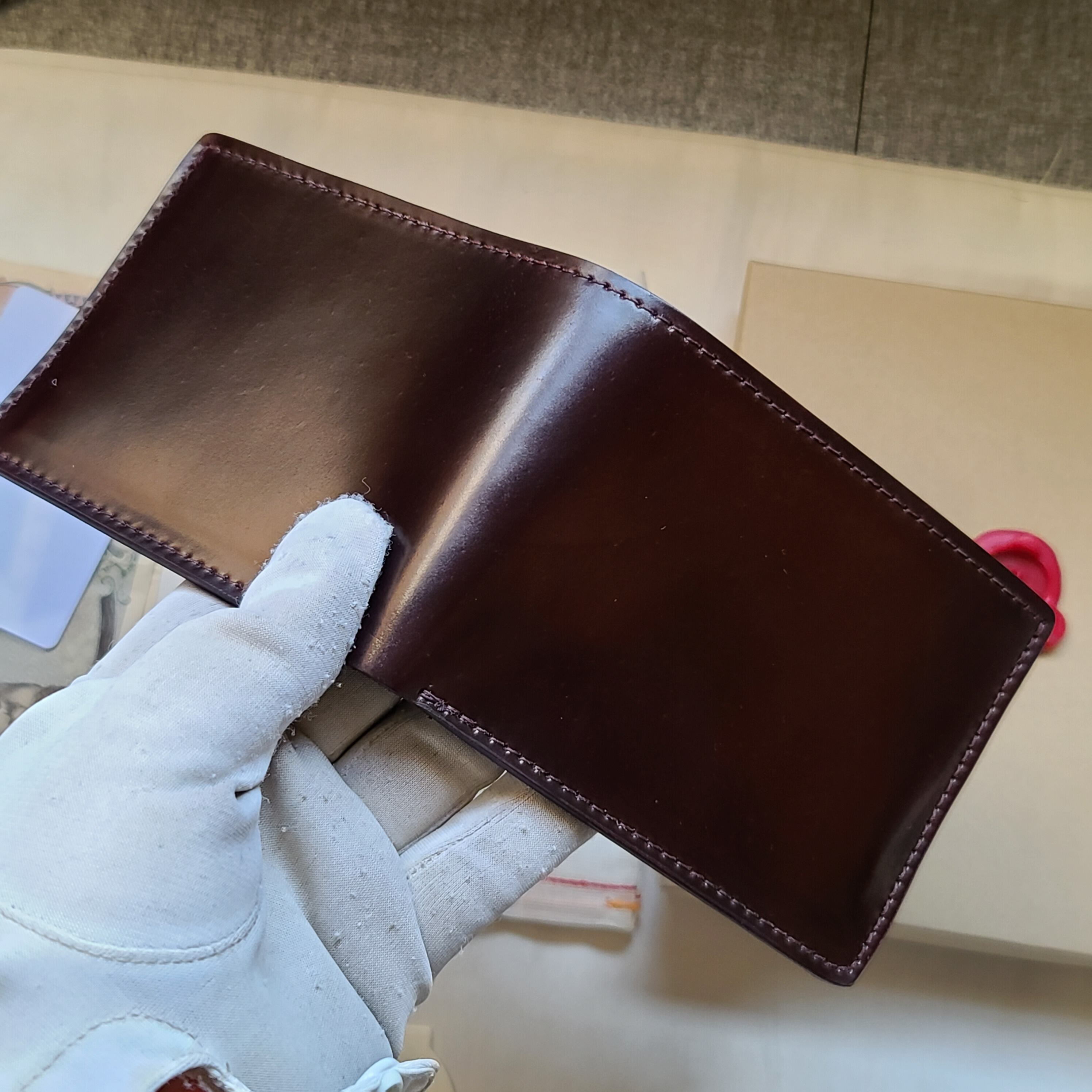 新品!値下げ交渉可!ダークバーガンディ シェルコードバンを使用!全てシェルコードバン使用の珍しい製品です。美しい外見や質感、機能面は所有感を満たしてくれます。内装に使用している薄いシェルコードバンは激レアです。