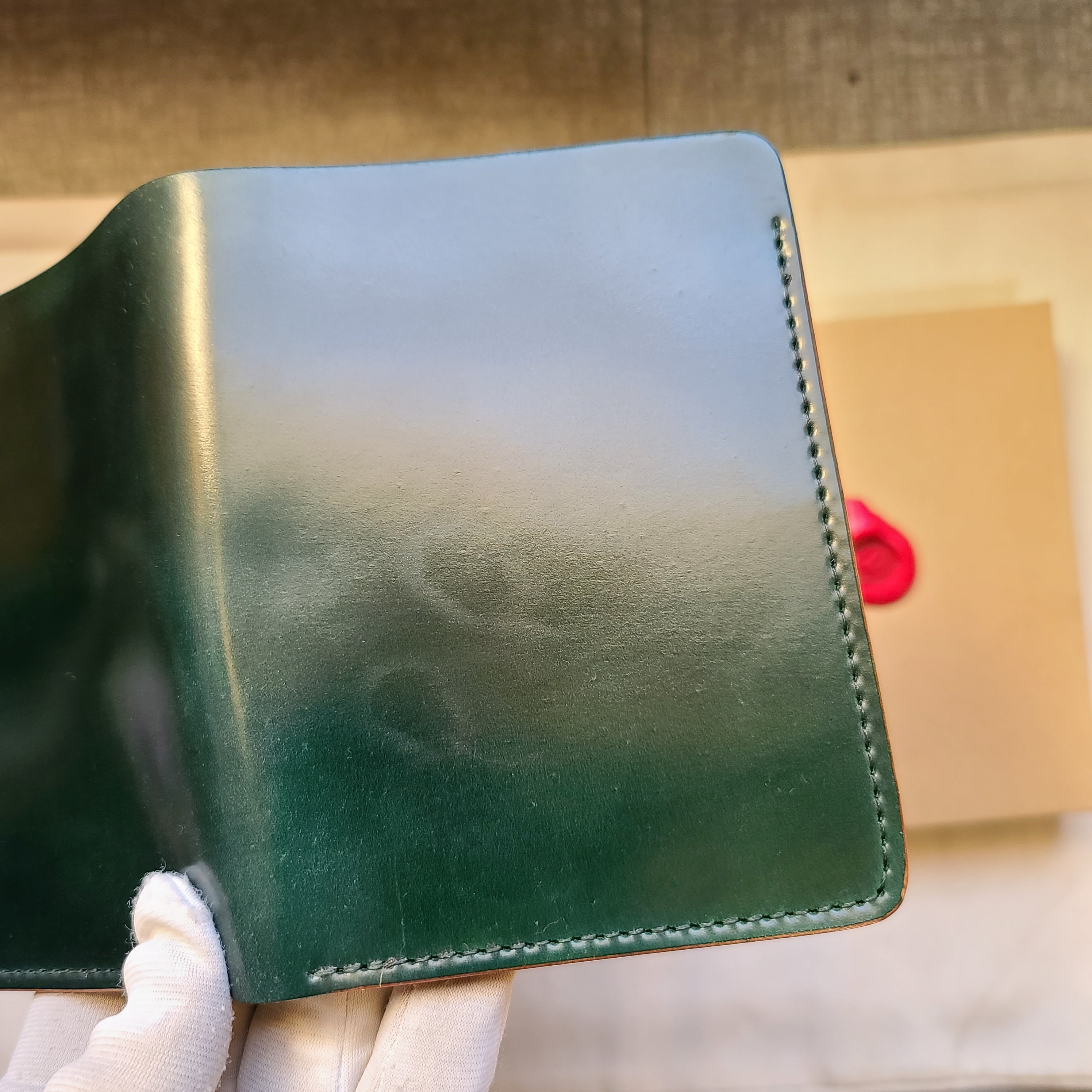 新品!ホーウィン製エメラルドグリーン、ウイスキー シェルコードバンを使用!革は全てシェルコードバンを使用した珍しい製品。エメラルドグリーンは、激レアです。ホーウィンと深い繋がりのあるアッシュランドレザーが取り扱える希少価値の高いシェルコードバンです。艶のある美しい外見は、所有感を満たしてくれます。