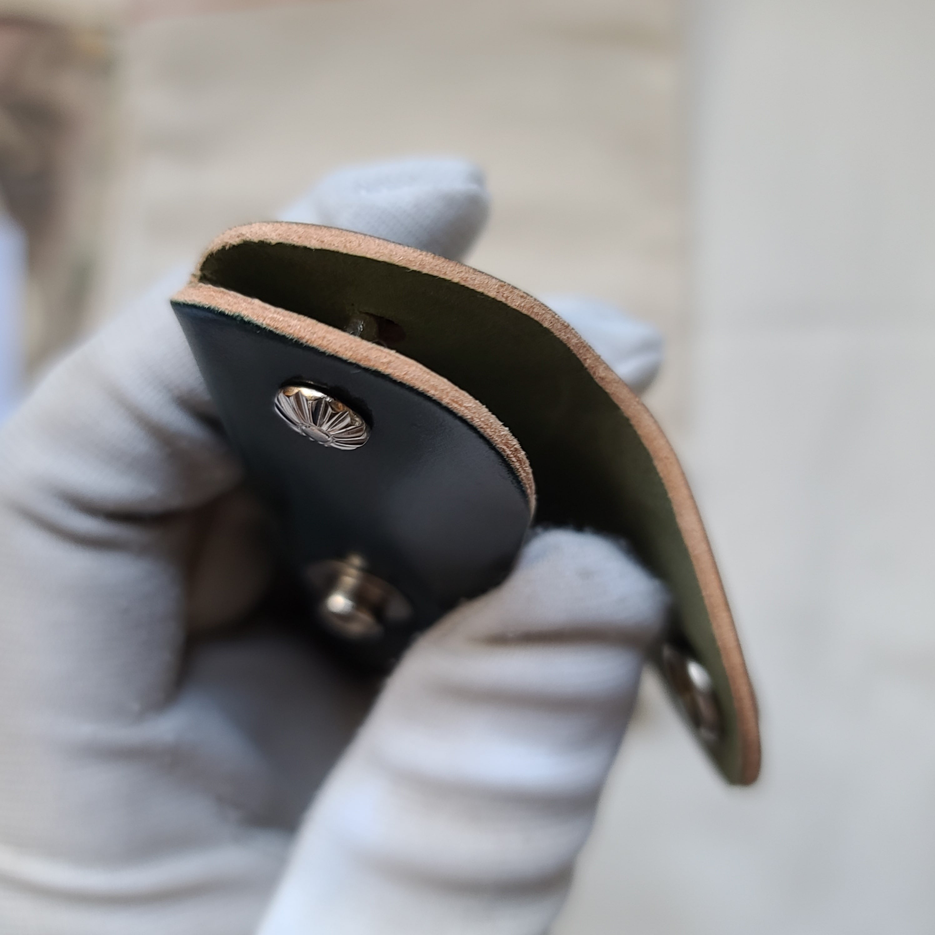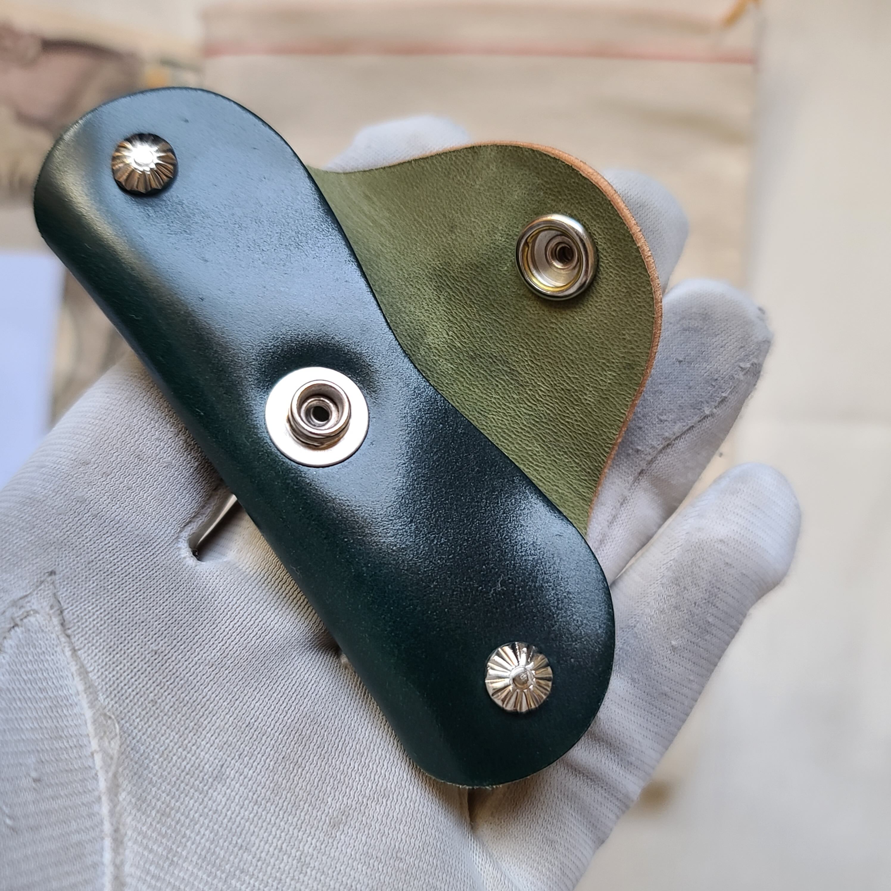 独特なキーホルダーは、しっかりと鍵を包みます。シェルコードバンを安価に堪能できます。初めてシェルコードバン製品を御検討される方にもオススメです。ネジを緩めて鍵を入れてまた閉めて使います。