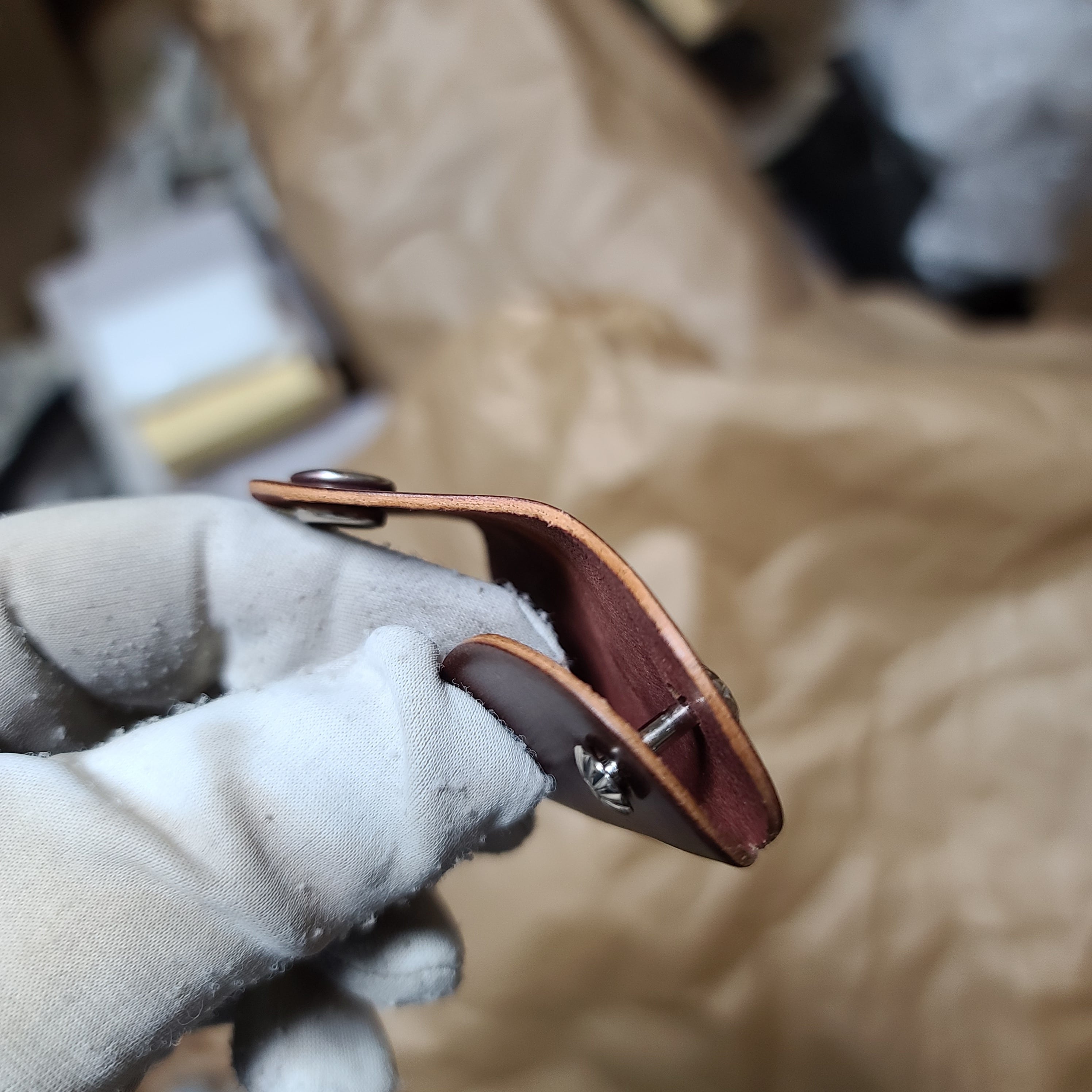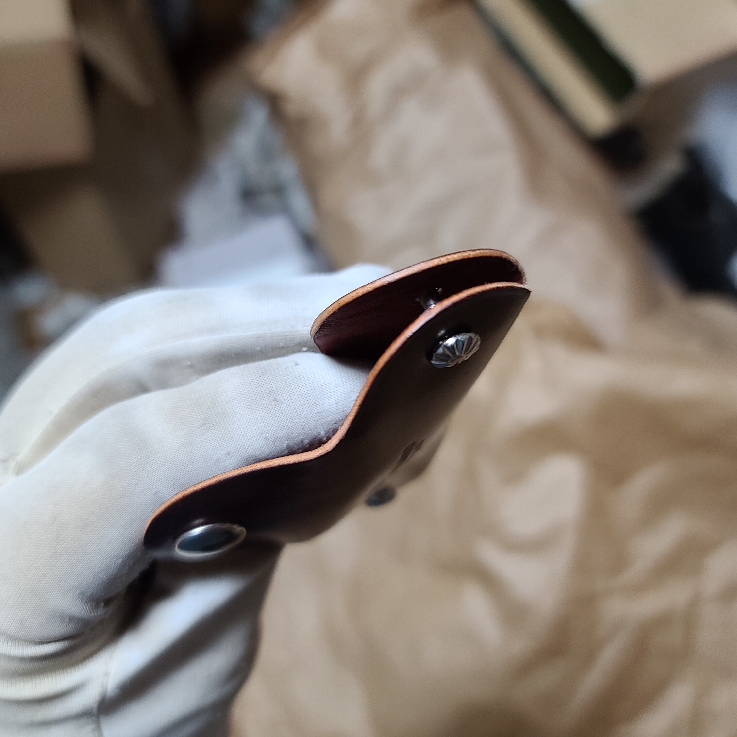 独特なキーホルダーは、しっかりと鍵を包みます。シェルコードバンを安価に堪能できます。初めてシェルコードバン製品を御検討される方にもオススメです。ネジを緩めて鍵を入れてまた閉めて使います。